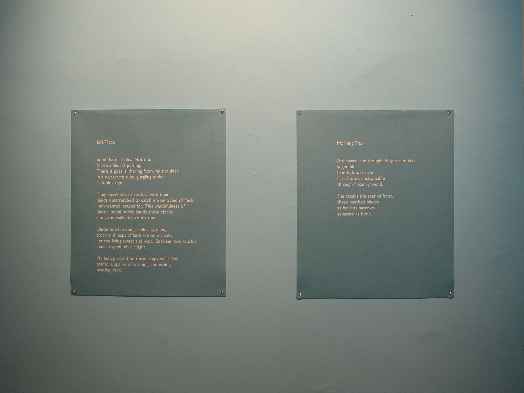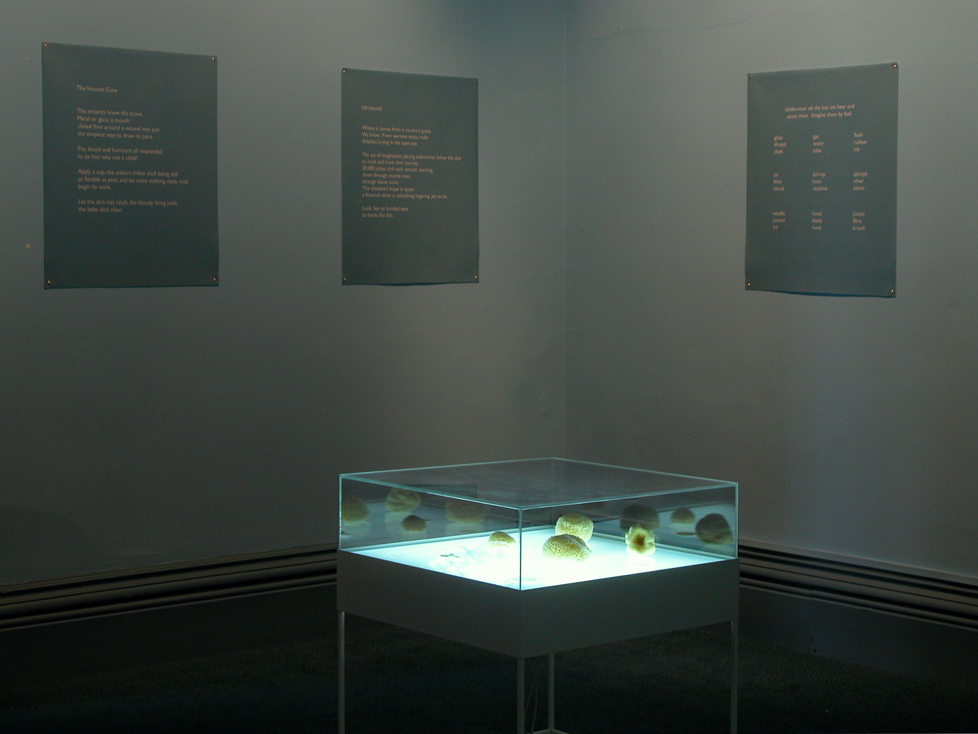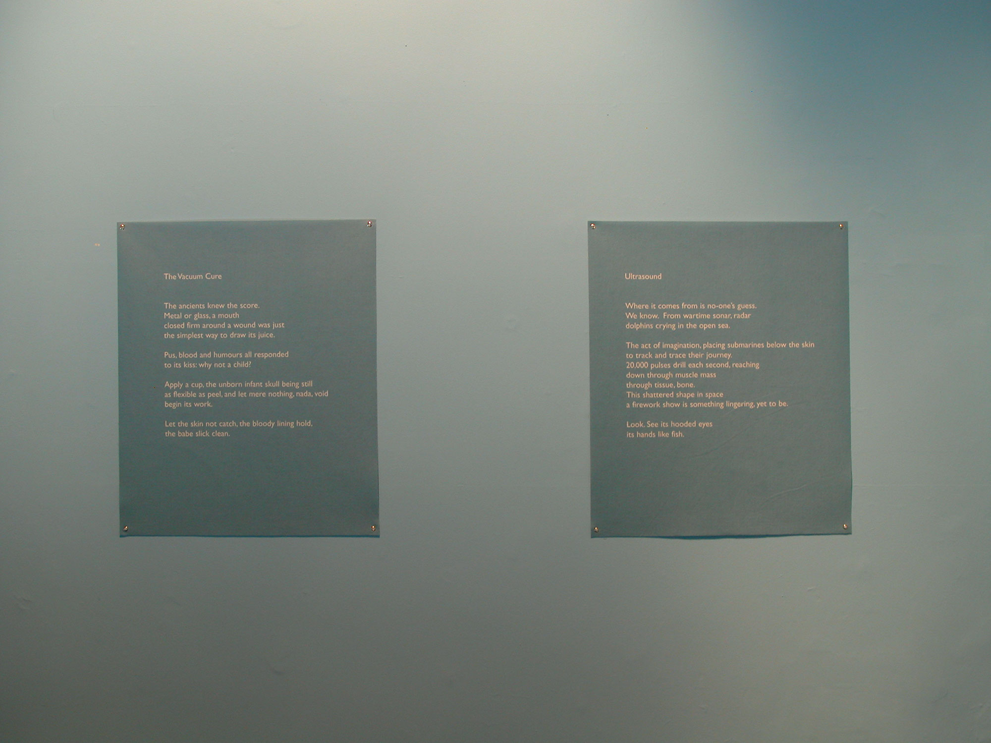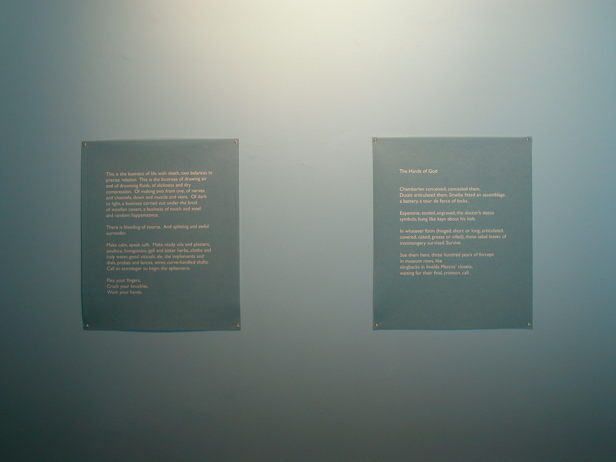 Collaborative exhibition and book by Anne Bevan and writer Janice Galloway. Installation with nine light tables containing sculptures, material and text relating to obstetrical instruments and processes. Surrounding the light tables are poems printed on sheets of felt.