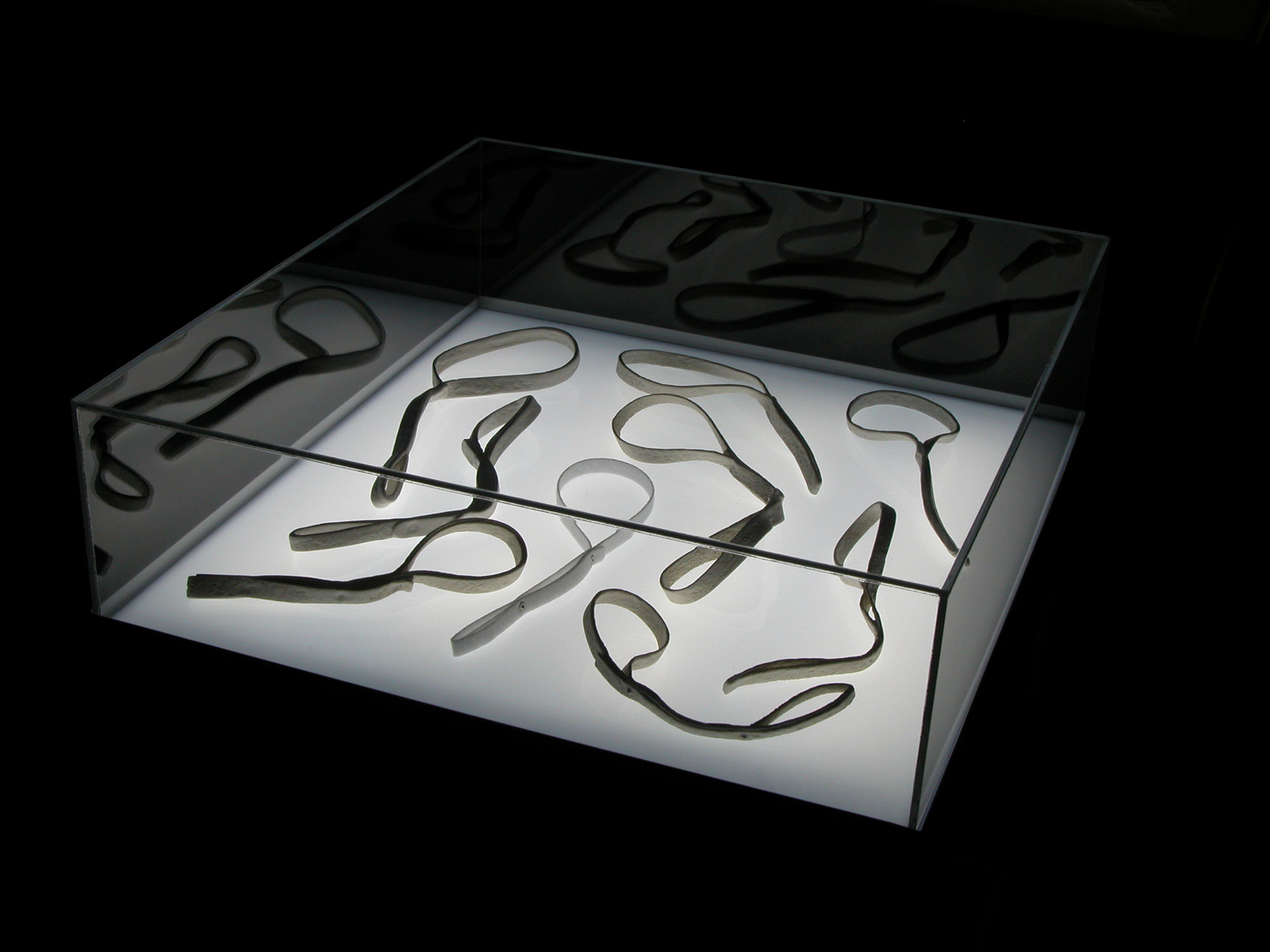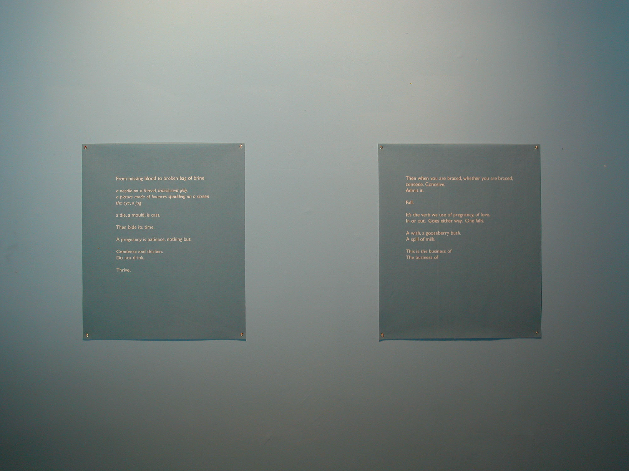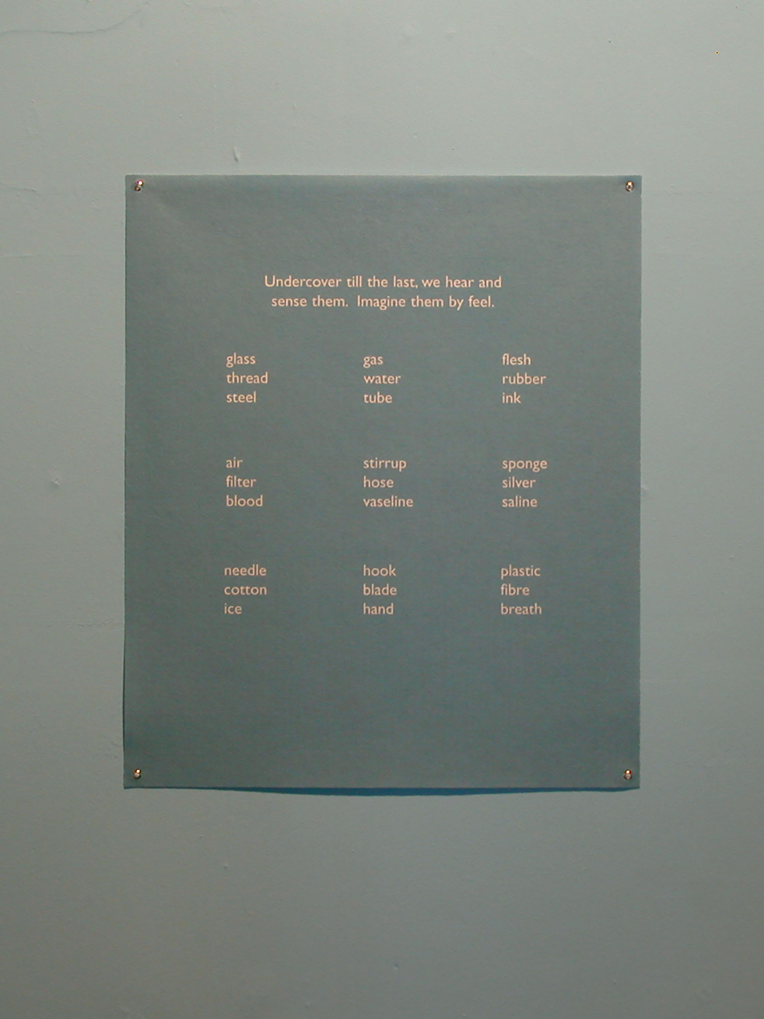 Collaborative exhibition and book by Anne Bevan and writer Janice Galloway. Installation with nine light tables containing sculptures, material and text relating to obstetrical instruments and processes. Surrounding the light tables are poems printed on sheets of felt.