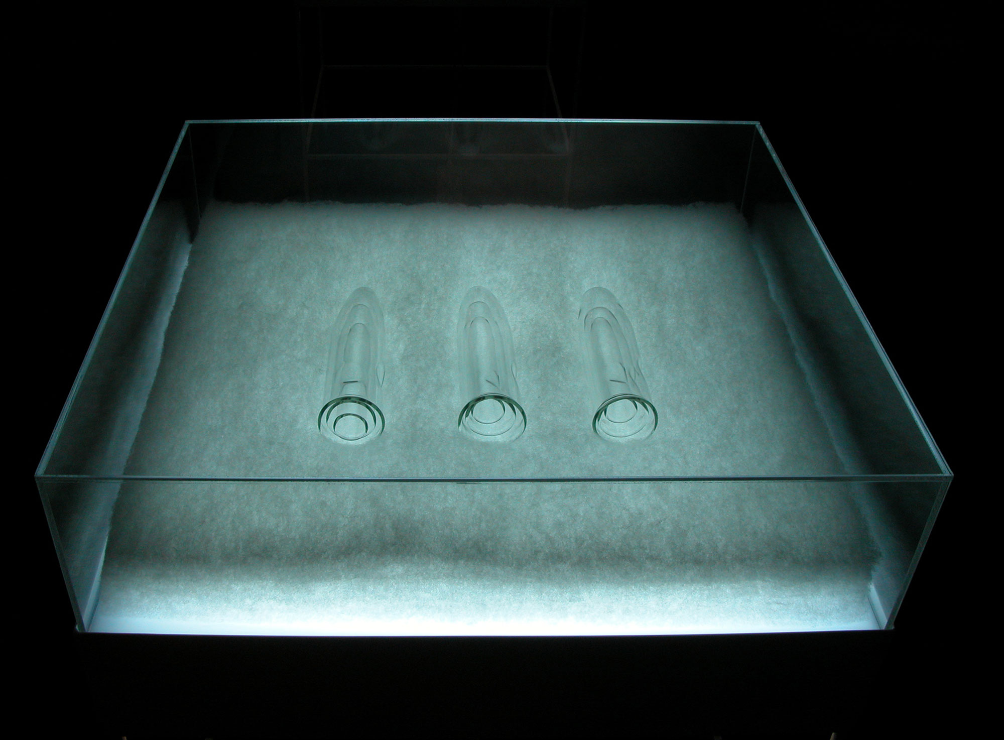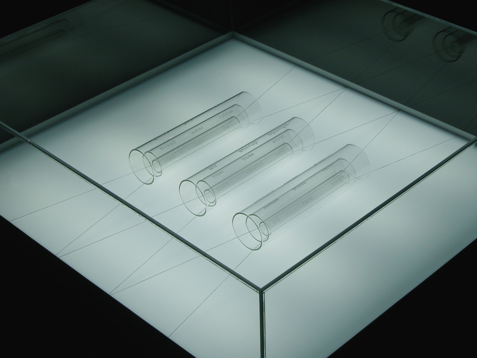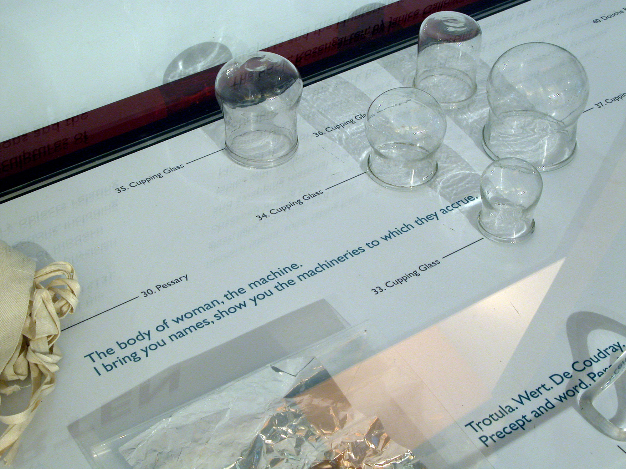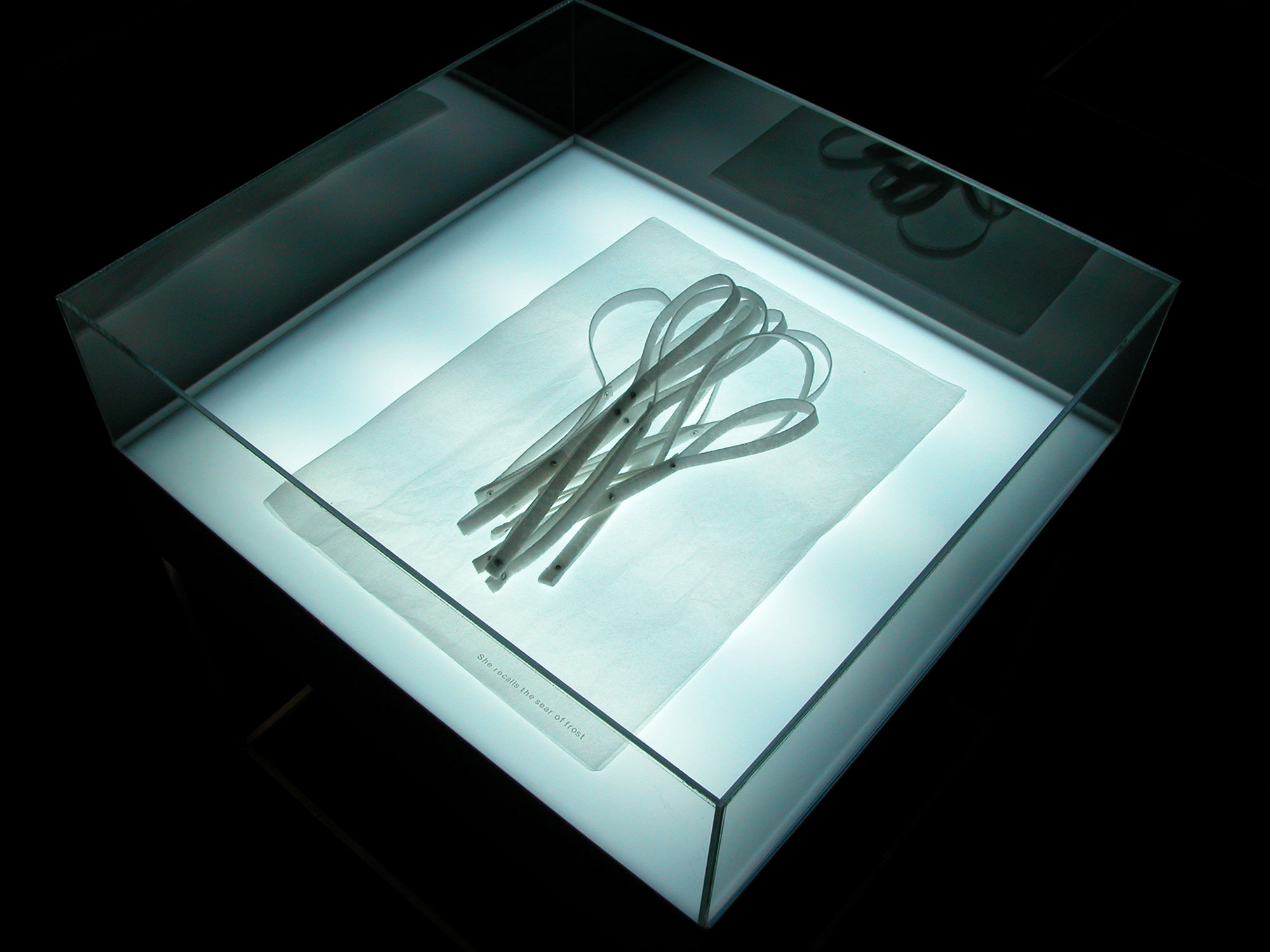 Collaborative exhibition and book by Anne Bevan and writer Janice Galloway. Installation with nine light tables containing sculptures, material and text relating to obstetrical instruments and processes. Surrounding the light tables are poems printed on sheets of felt.