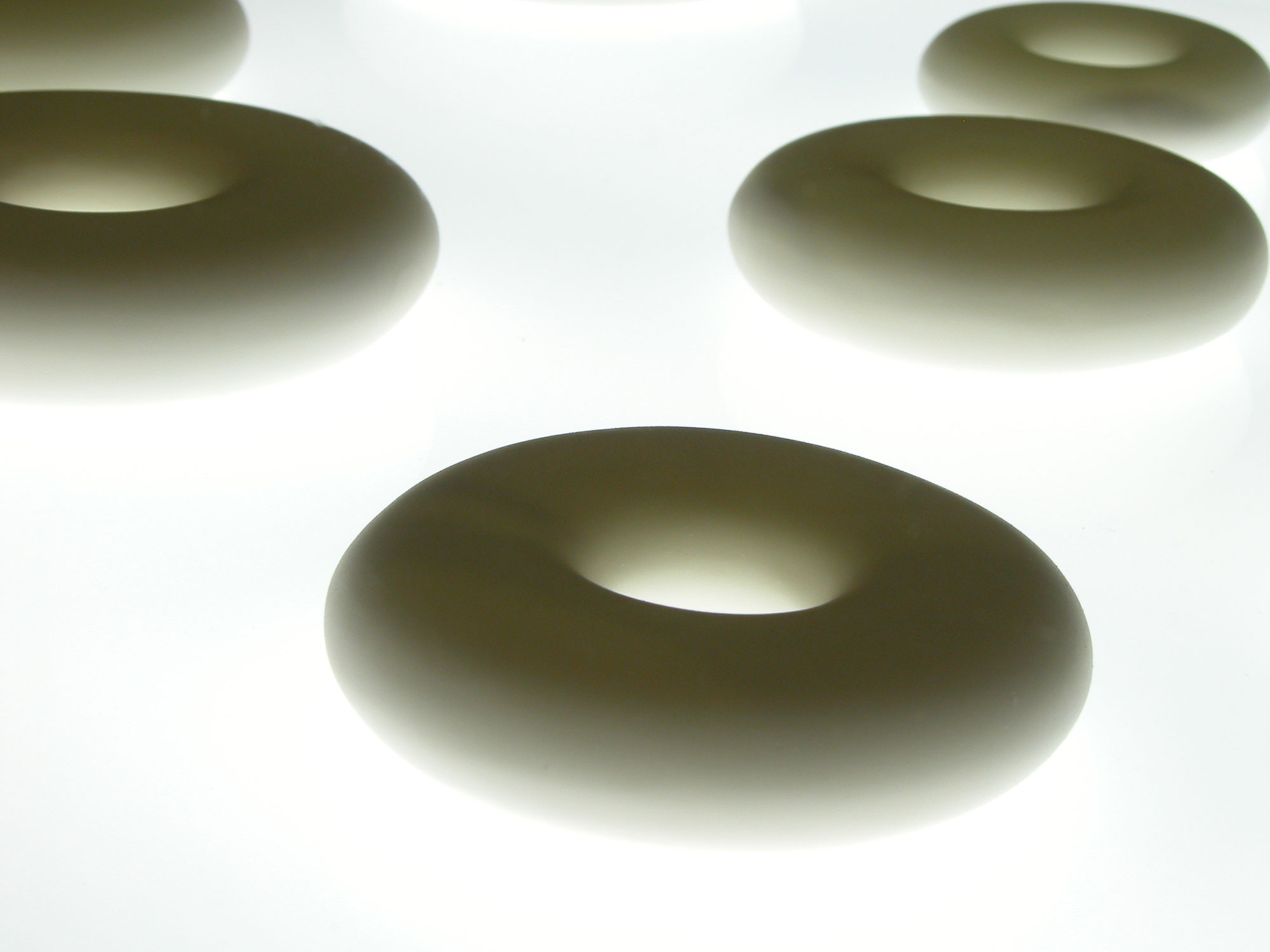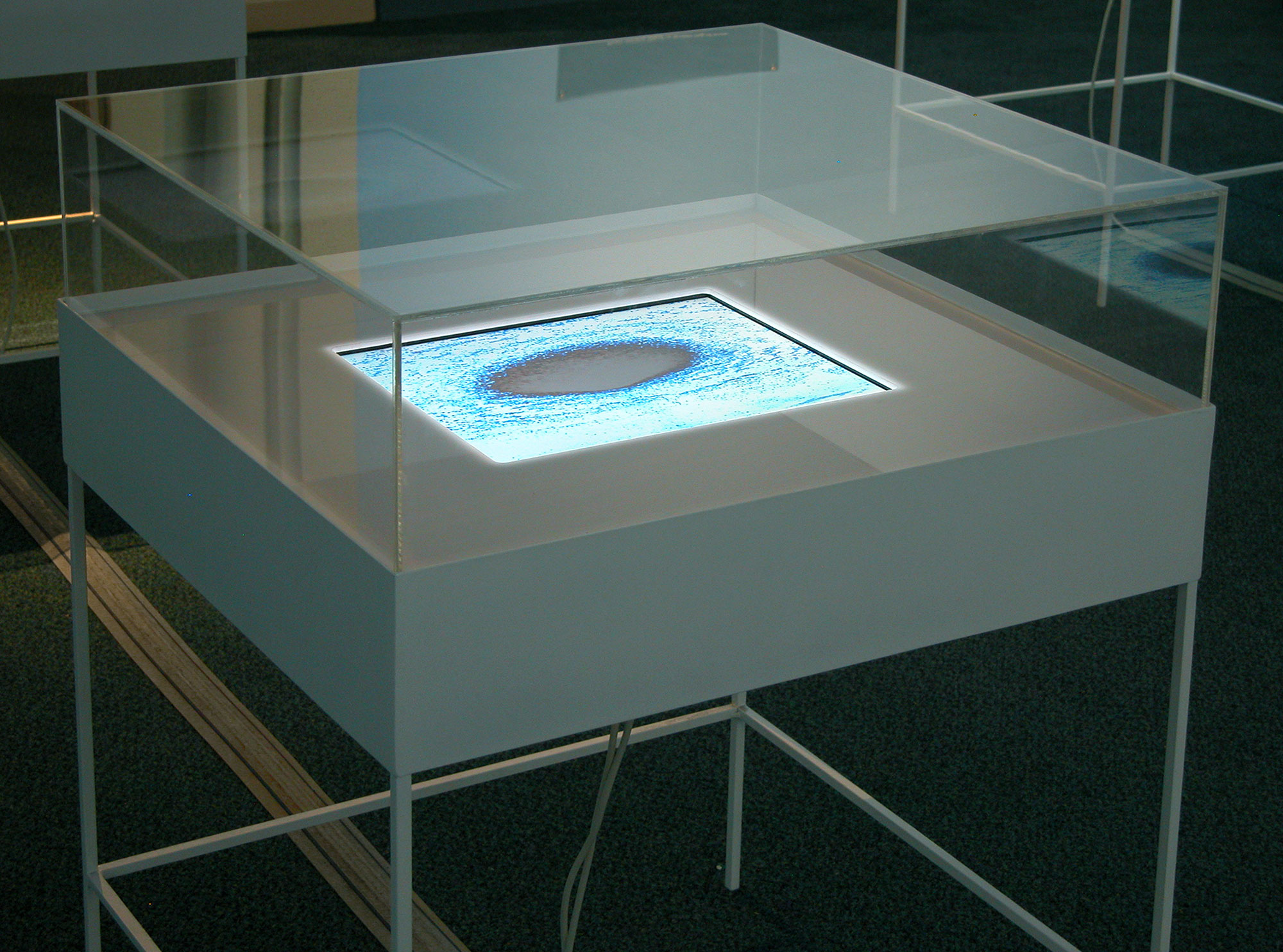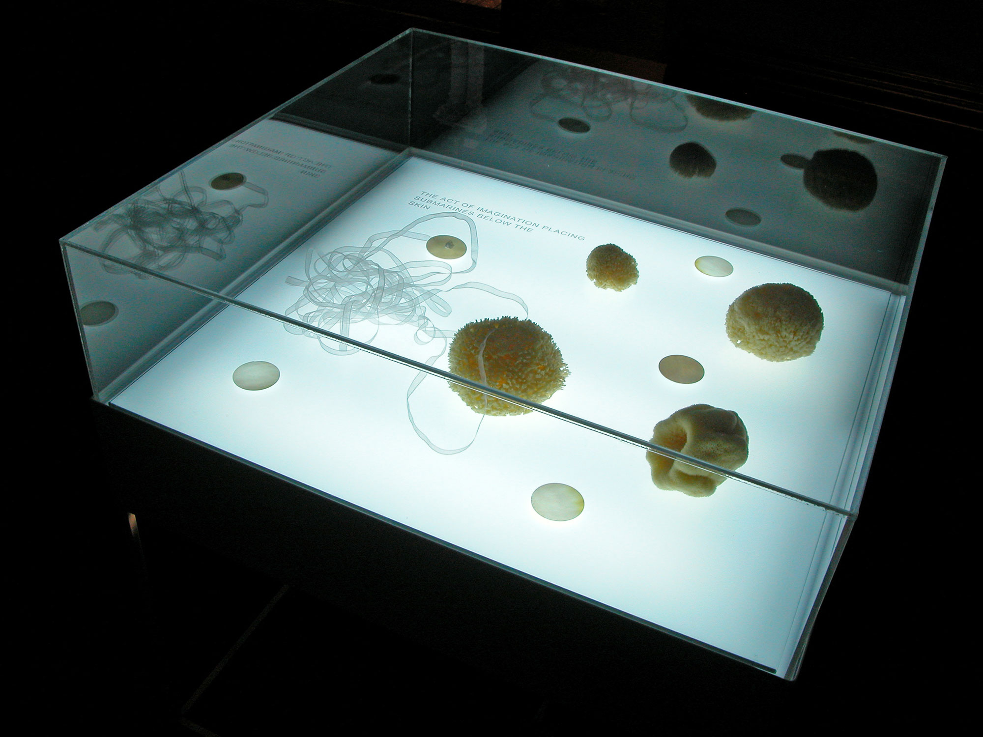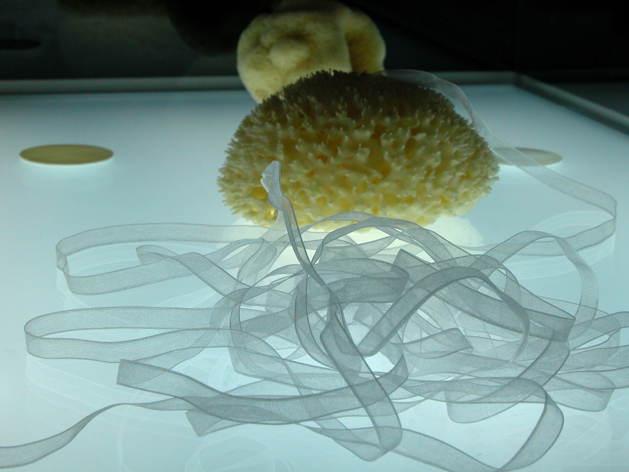 Materials: felt, Jesmonite, silver encapsulated Jesmonite, borosilicate glass, foam, porcelain, natural sponge, mother of pearl, silk, cotton wool, video on flat screen monitor, inkjet text on felt.