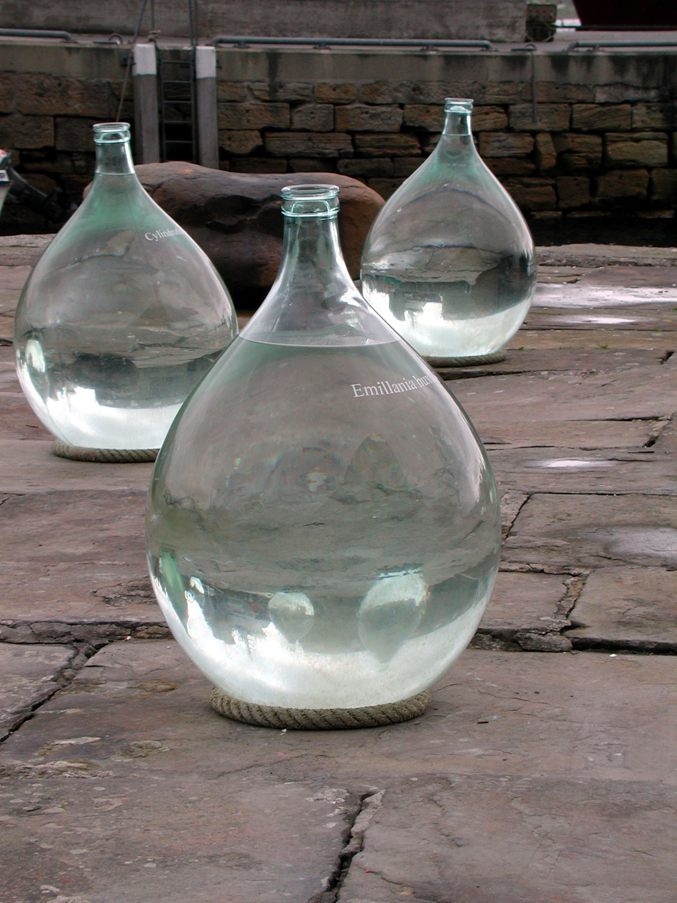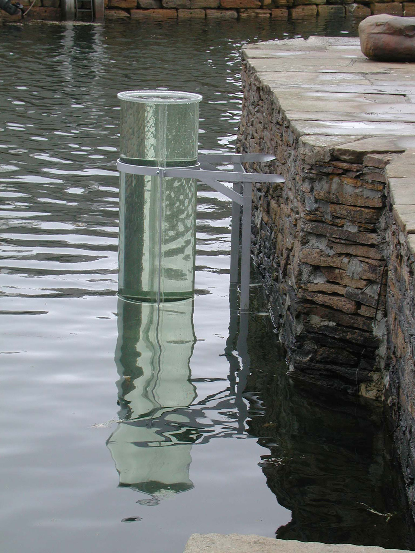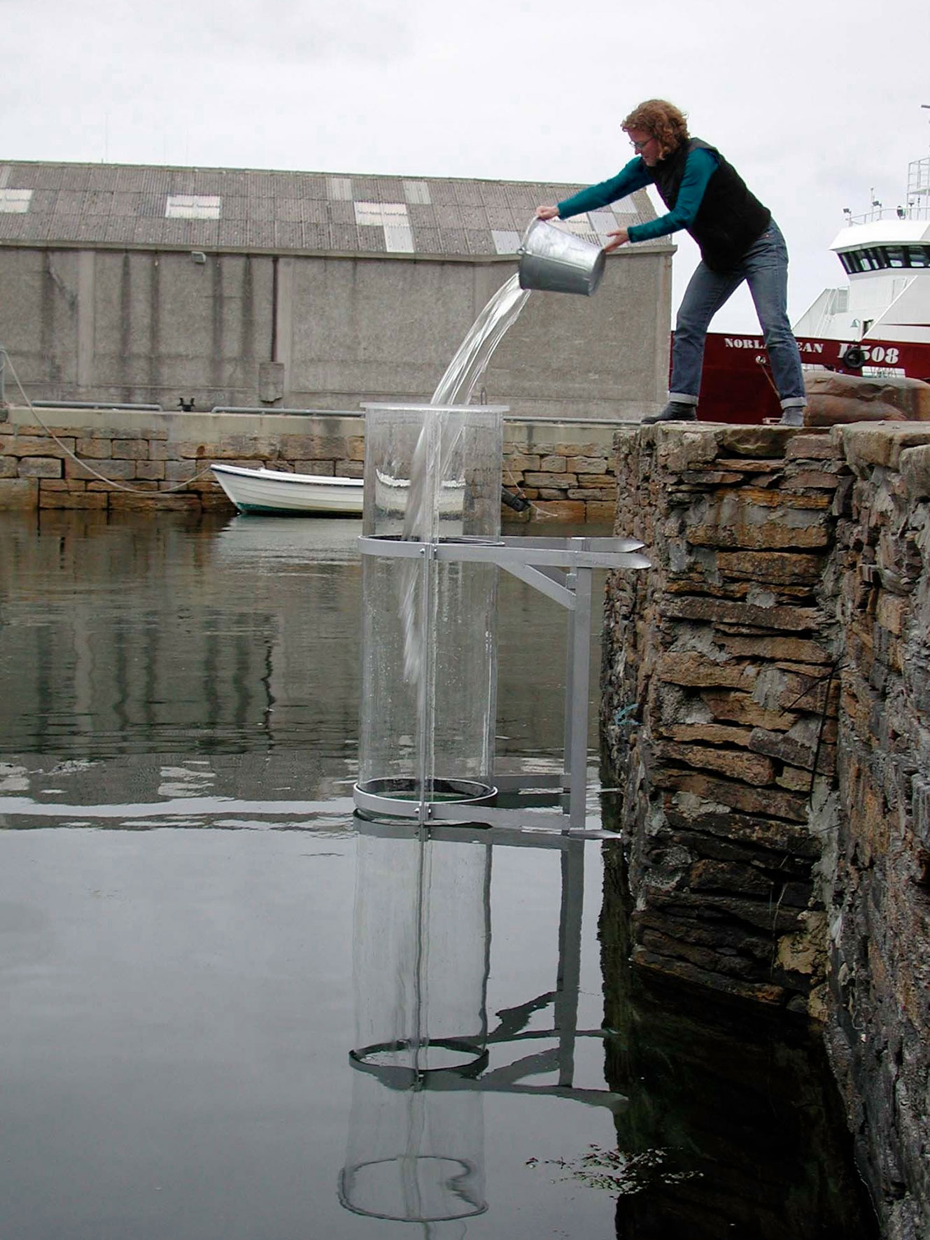 The cylinder was filled with water transported from Venice, like a test tube or a core sample, measuring and revealing the different waters, North with South. Apart from showing the potential beauty of water, the ‘source’ project raises issues concerning international communication and environmental implications of industry, energy and transportation. As a result, part of the project involved scientific analysis and tests of both waters. An installation in the Pier Arts Centre included video projection of the collecting of water from the Grand Canal, print of the water analysis, wall drawing of map and a galvanised bucket.